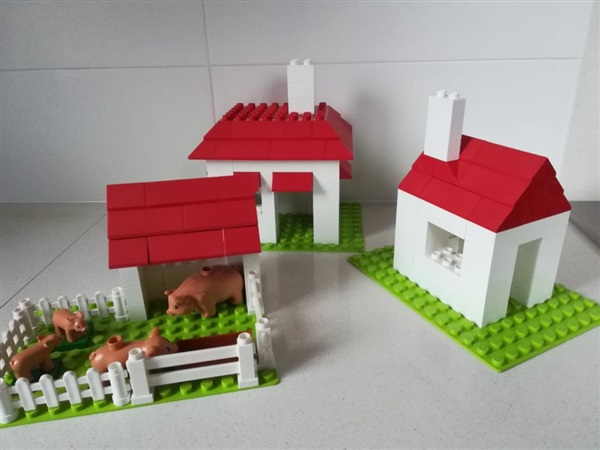Alle kinderen maken van witte bouwstenen en rode dakpannen huisjes op kleine grondplaten. Ze mogen hun